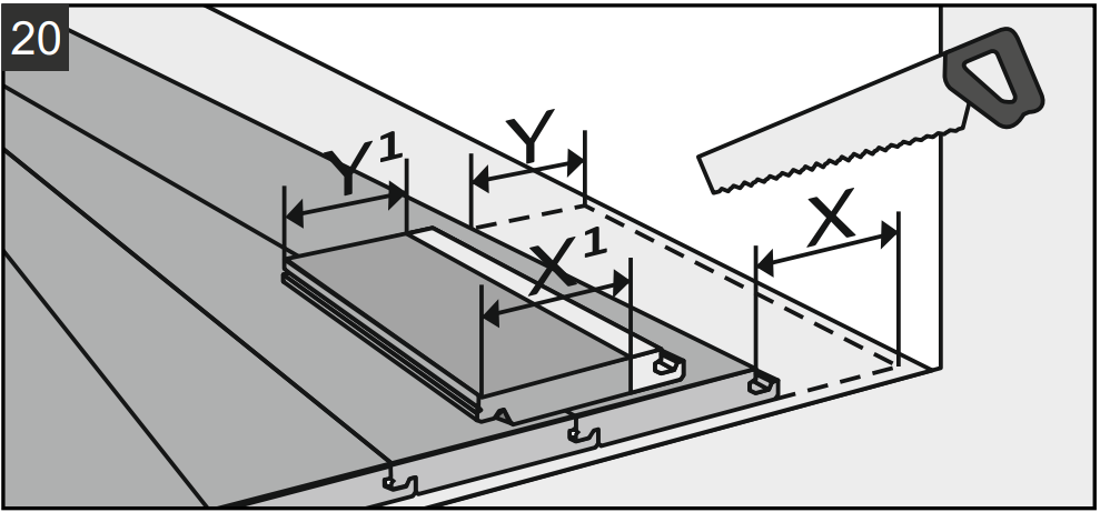 8.2. Если ширина последнего ряда меньше 50 мм, необходимо подрезать плашки первого ряда, чтобы сместить все напольное покрытие в центр.