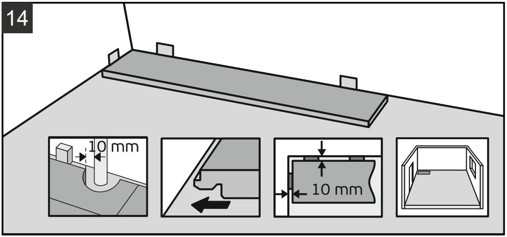 9.1. Укладывайте плашки с учетом зазоров 10 мм (рис. 14) от всех стен и иных неподвижных сквозных конструкций (труб, дверных ограничителей, внутрипольных конвекторов и др.). Для расширения используйте монтажные (распорные) клинья.