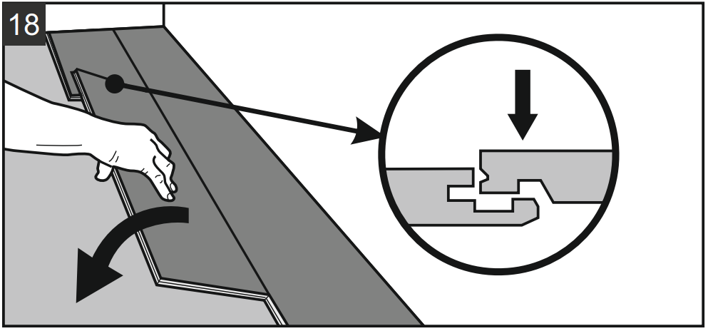9.2. Соедините плашки, нажав на торец до щелчка. Следите, чтобы плашки находились близко друг к другу. При формировании поперечного шва отдельные плашки в ряду не должны смещаться в сторону. Замки должны быть без повреждений и без мусора.
